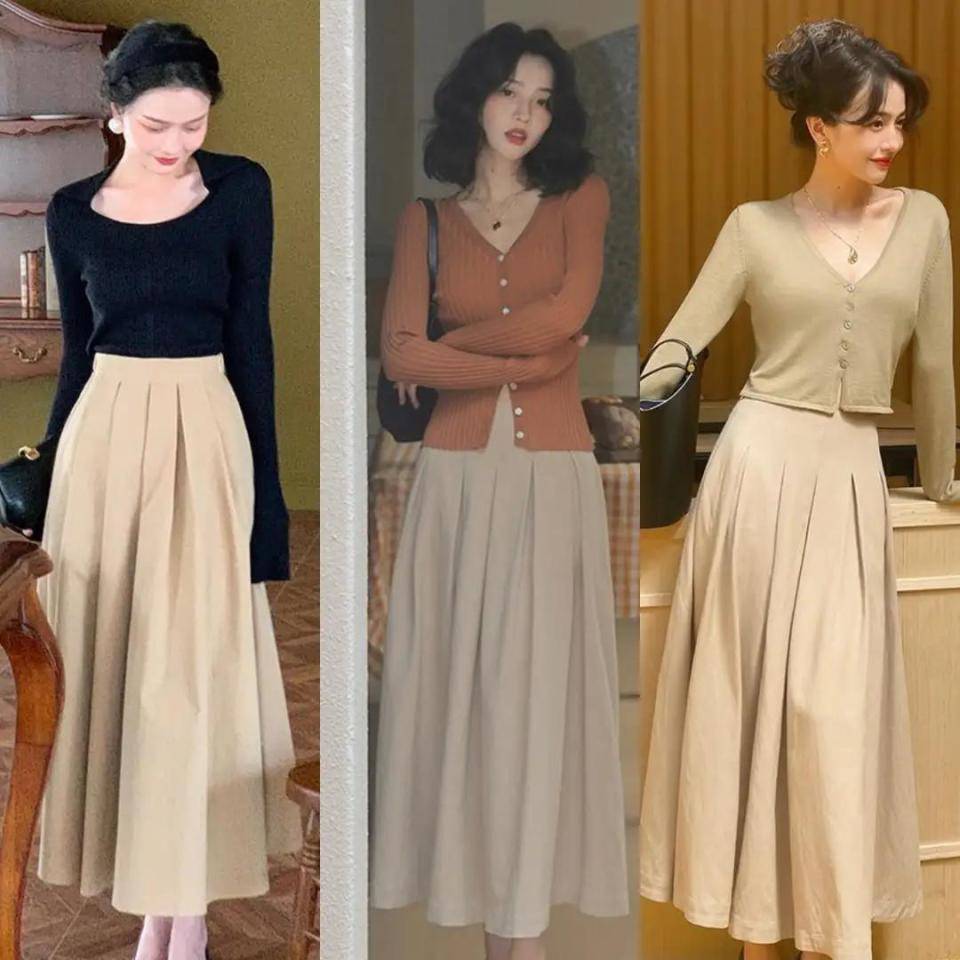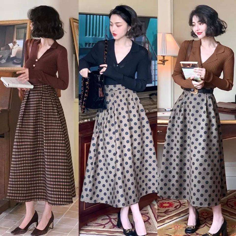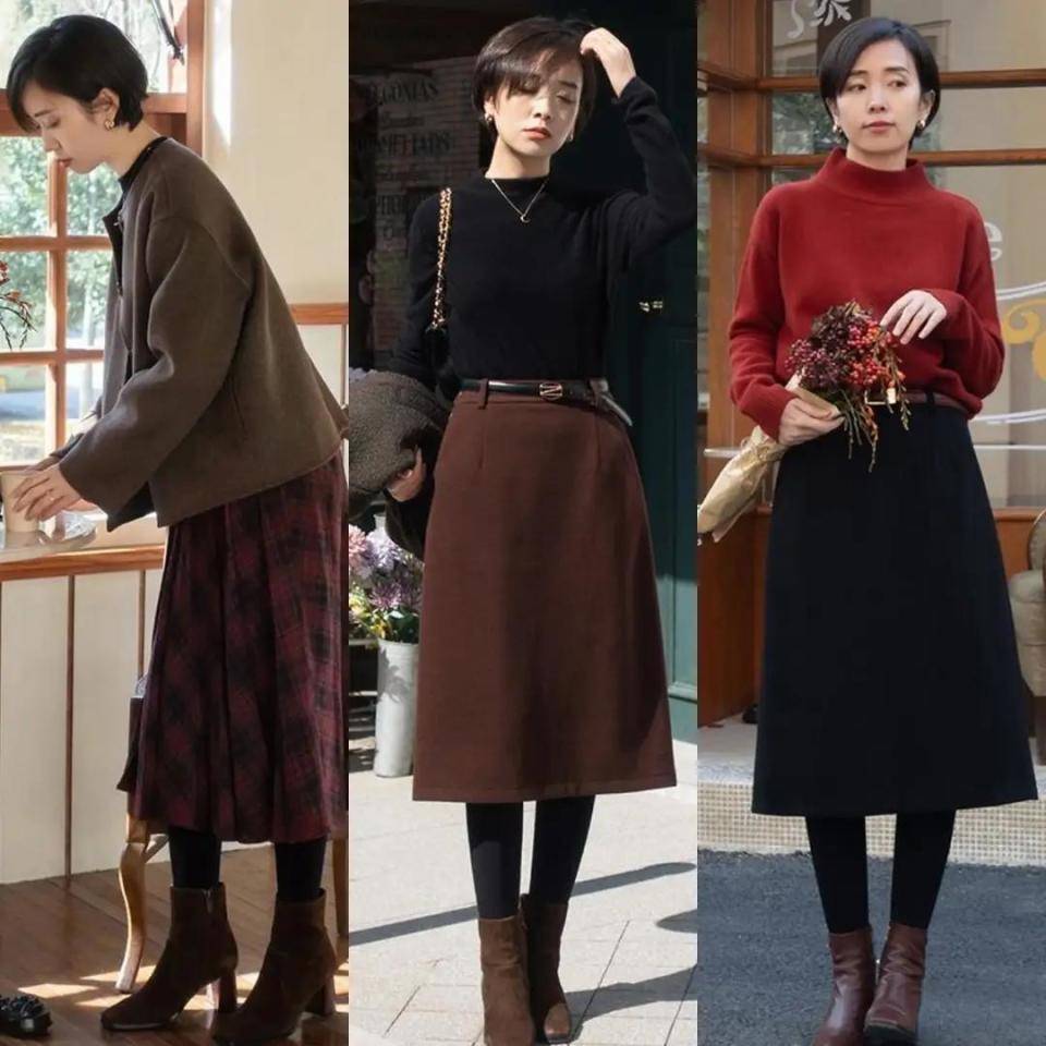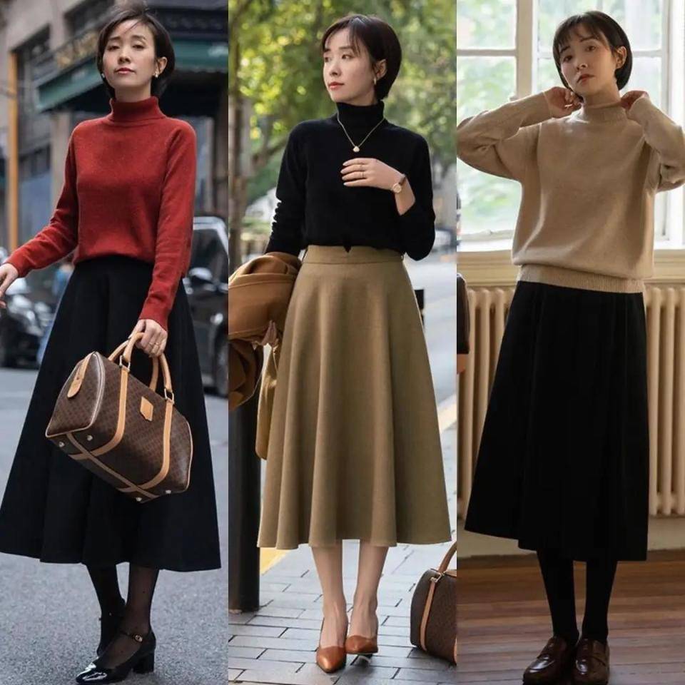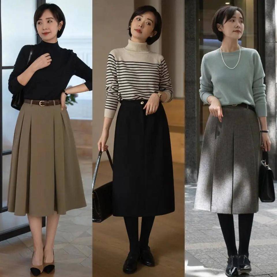 身材不同,选择的穿衣风格自然有所不一样,不过都是要想方设法的去提升我们的腰线,使得身材形成一个三七分,下半身更修长,比如下面用棕色咖色藏蓝色的针织开衫,搭配上高腰收腰款的伞状半身裙,穿的时候把上衣的衣角塞进裙子里面,再勒上一款黑色的腰带就能很好的提升腰线,又能勒出你的小蛮腰,可以说是一举两得。