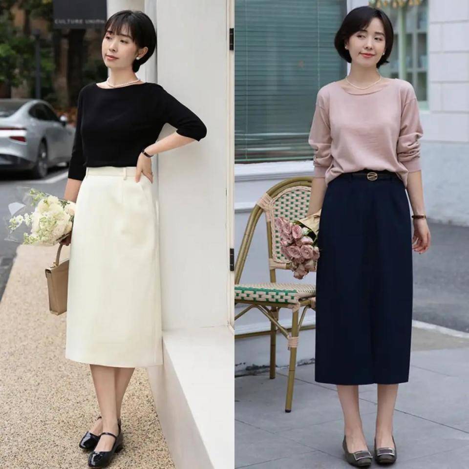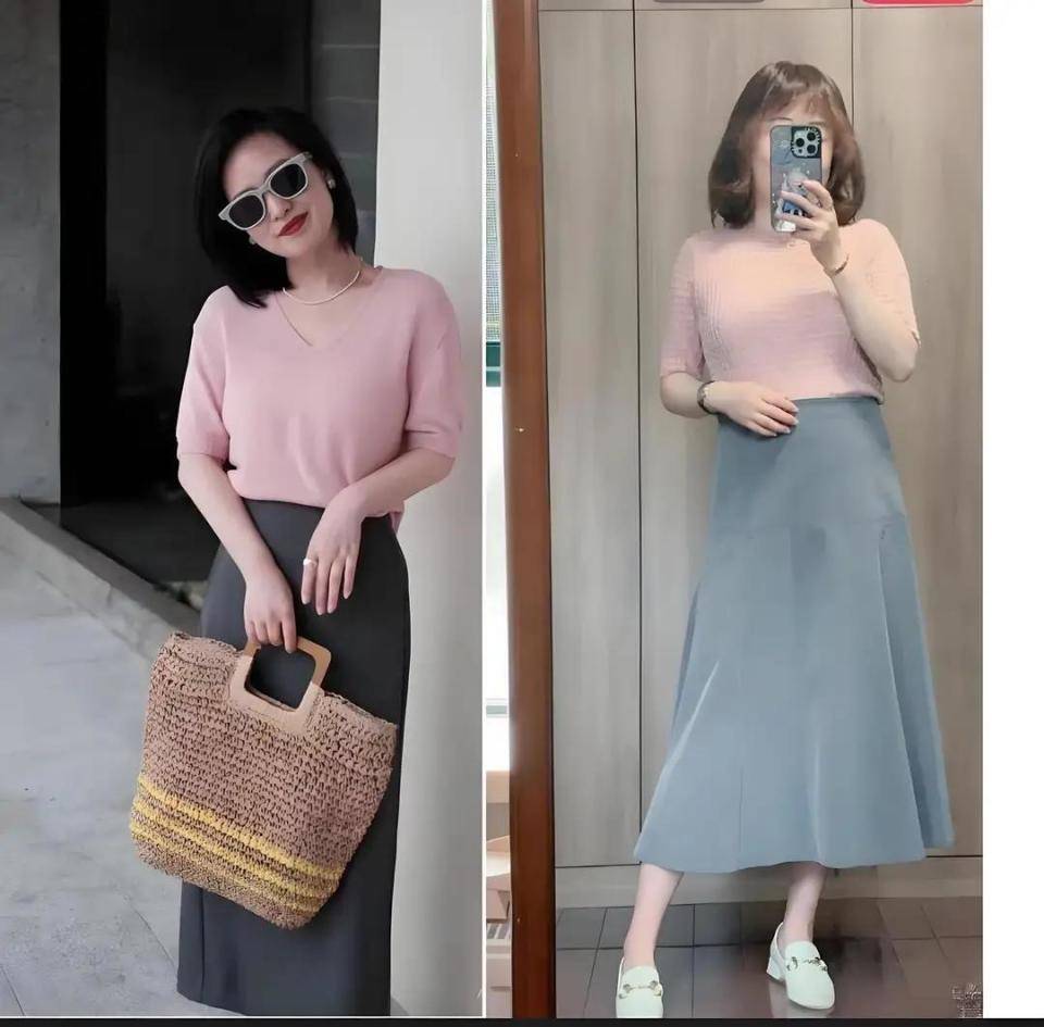 想要身材线条更流畅的情况下,你可以把散装的半身裙换成下面这种灰色的直筒半身裙,搭配上一件粉色的针织短袖上衣就够,看起来还让你显白显嫩,显年轻。