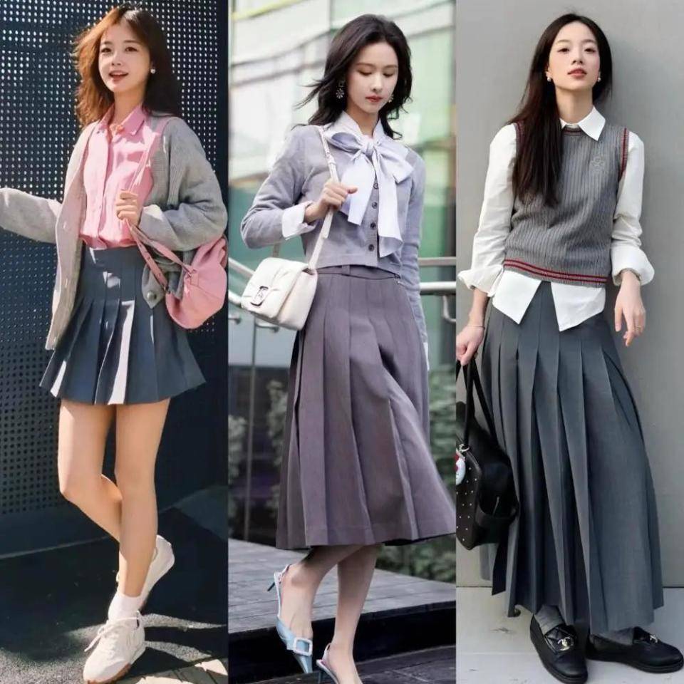 年轻貌美的00后美少女,这个时候我们可以直接选择一件灰色的针织开衫,内搭粉色的衬衫,再加上黑色的压着短裙,形成一个下半身失踪的穿搭技巧,展现你的美腿更加的抢眼抢镜,活力四射,走起路来自带风。
