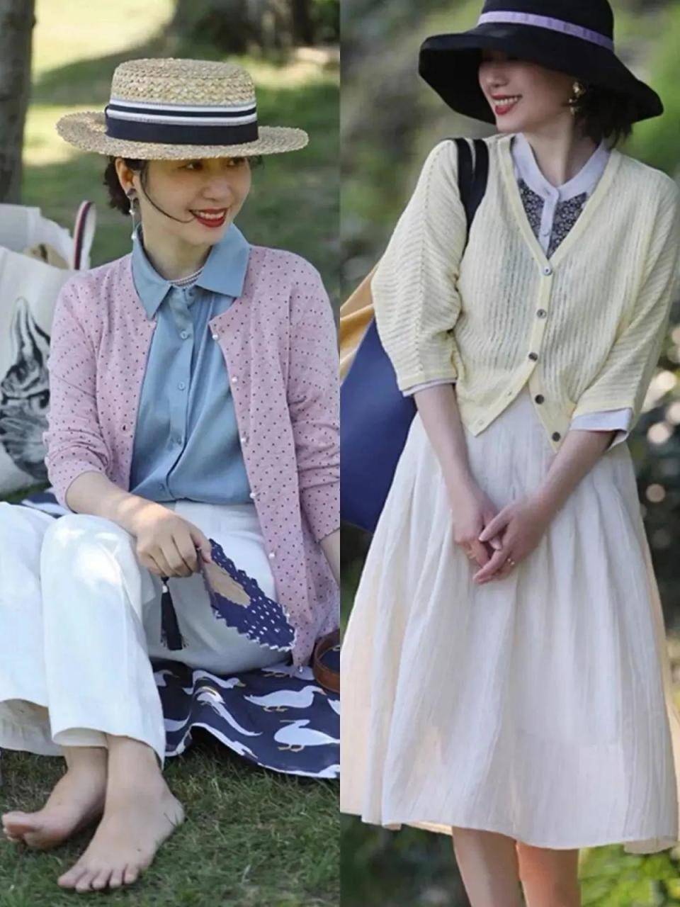 例如下面这位素人直接选择一件浅黄色的短款针织开衫,内搭一件黑白拼接的针织打底衫,再加上一条白色的伞状半身裙,头上戴了一顶大檐帽,这样的搭配,你还真别说,有一种优雅减龄的感觉,非常的大气,年轻十岁都不止。