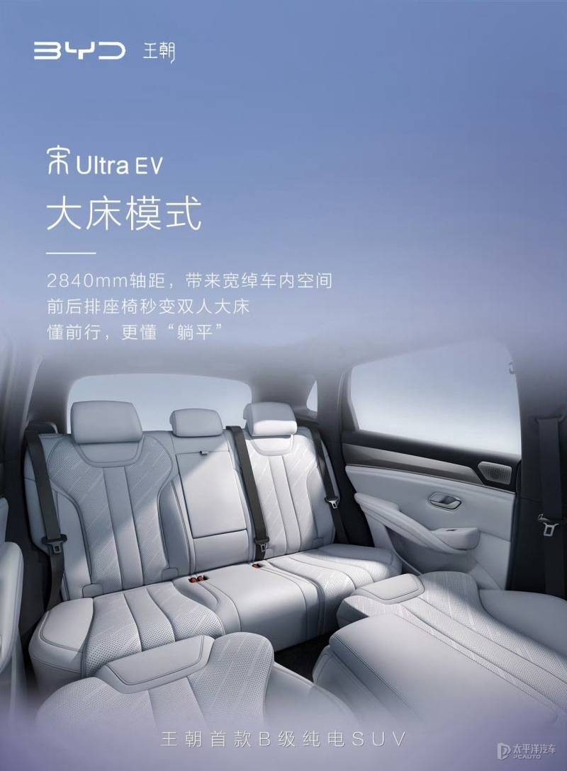 从发布的内饰官图来看,比亚迪宋Ultra EV延续了家族式布局,整体风格简约时尚,采用超大尺寸悬浮式中控屏和液晶仪表组合,搭配双辐式平底方向盘,应用电子怀挡式换挡。同时,新车配有大床模式,前排座椅放倒后与后排座椅平行。