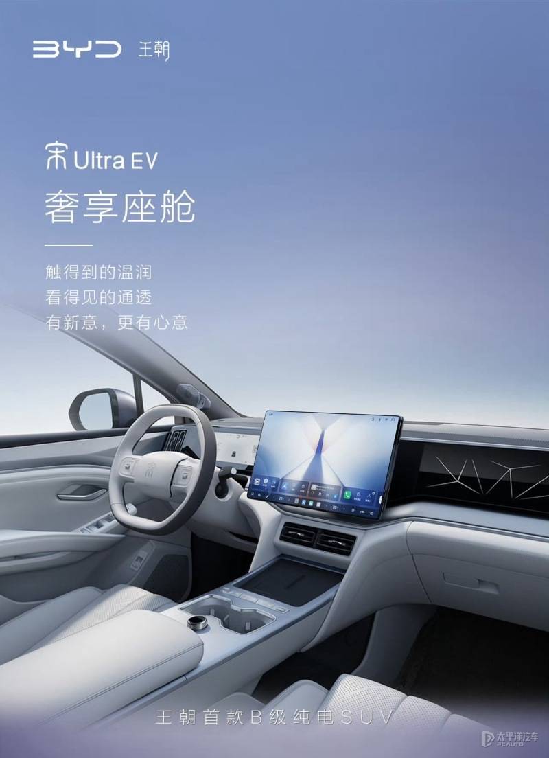 【太平洋汽车 新车频道】2月25日,比亚迪王朝网销售事业部总经理路天在社交平台发布了比亚迪宋Ultra EV内饰官图,新车配备超大尺寸悬浮式中控屏和双辐式多功能方向盘。该车此前已在工信部完成申报,定位中型纯电SUV,搭载最大功率270千瓦后驱动电机,CLTC纯电续航最高710km,并配备激光雷达。