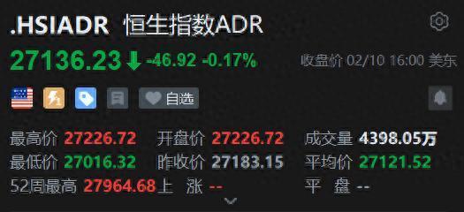 智通财经APP获悉,周二,美股三大指数涨跌不一。恒生指数ADR下跌,按比例计算,收报27136.23点,较香港收市跌46.92点或0.17%。