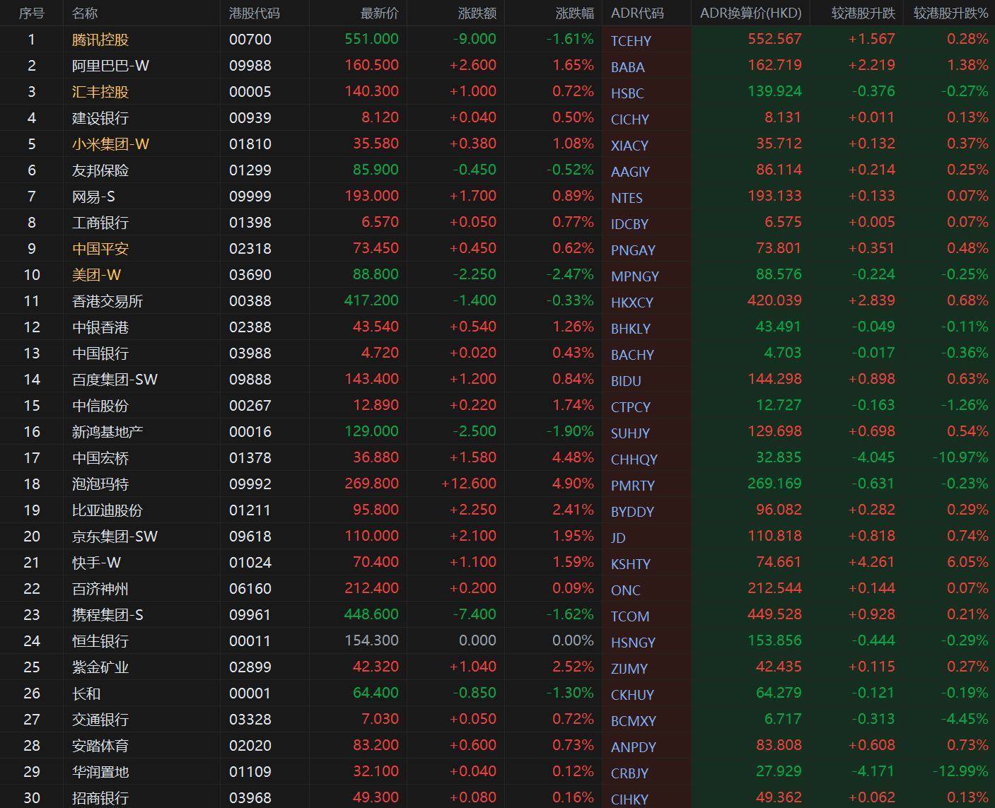大型蓝筹股多数上涨,汇丰控股收报139.924港元,较香港收市跌0.27%;腾讯控股收报552.567港元,较香港收市涨0.28%。