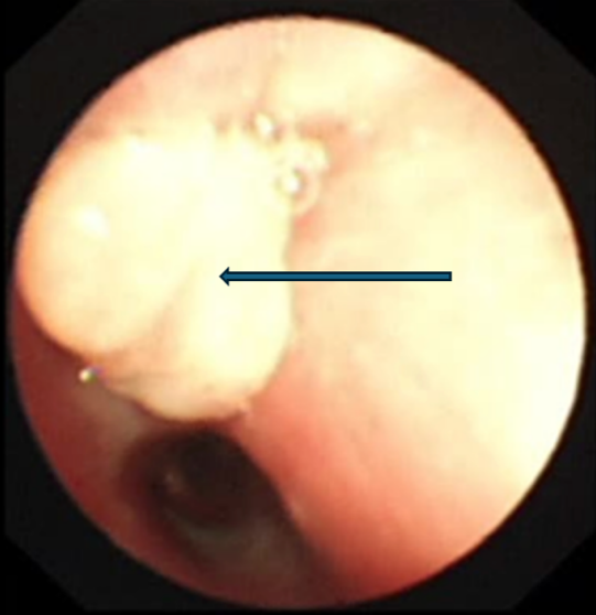 支气管镜检查显示右上叶支气管肉芽增生,完全堵塞开口