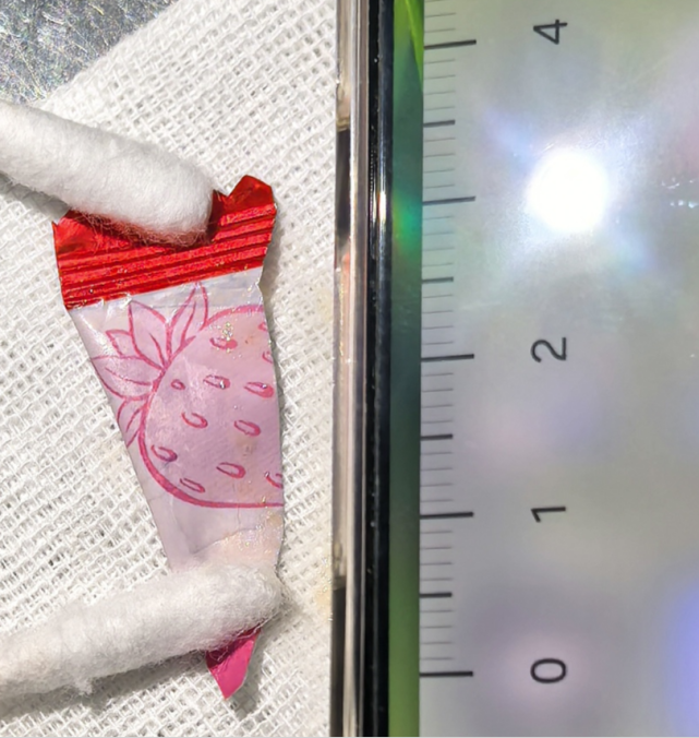 在呼吸科支气管镜室,张东伟主治医师和叶颖龙主管护师紧密配合,小心清理了分泌物,最终用异物钳成功钳取出异物——竟是一颗草莓味糖果的包装纸!展开测量,长度接近3.5厘米。